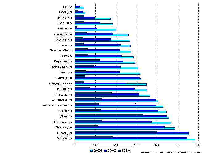 Изменения в демографическом поведении жителей Северной и Западной Европы в последней трети XX в. (М. Клупт. Демография регионов Земли) Демографические процессы и их До перелома (1950 -1960 -е составляющие гг. ) Браки и разводы Доля населения, состоящего в браке Высокая Выступление в брак Более ранее Распространенность внебрачных союзов Низкая Распространенность разводов Низкая Вступление в новый брак после развода Достаточно частое и смерти супруга Рождаемость Динамика и уровень Снижение Возраст рождения детей Контрацепция Доля брачных пар, не родивших на протяжении все продолжительности брака ни одного ребенка Доля детей, рожденных вне брака После перелома Относительно низкая Более позднее Высокая Становится более редким Стабилизация на уровнях, не обеспечивающих простое замещение поколений Средний возраст рождения первенца снижается; наблюдается растет; часть рождений «переносится» снижение рождаемости в старших на более поздний возрастах Менее эффективна Более низкая Снижается Более эффективна (за исключением отдельных социальных и демографических групп) Более высокое Растет, в том числе за счет рождения детей во внебрачных союзах