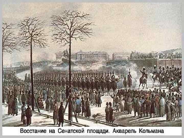 Соотношение сил Декабристы Около 3 тыс. человек Московский полк Гвардейский морской экипаж Лейб-гвардии гренадерский полк Николай I • 9 тысяч пехотинцев • 3 тысячи кавалерии • артиллерия