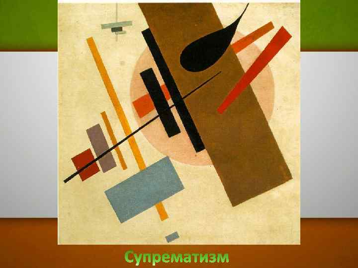 Супрематизм Это направление в авангардистском искусстве, основанное в 1 -й половине 1910 -х гг К. С. Малевичем. Являясь разновидностью абстракционизма, супрематизм выражался в комбинациях разноцветных плоскостей простейших геометрических очертаний (в геометрических формах прямой линии, квадрата, круга и прямоугольника). Сочетание разноцветных и разновеликих геометрических фигур образует пронизанные внутренним движением уравновешенные асимметричные супрематические композиции.