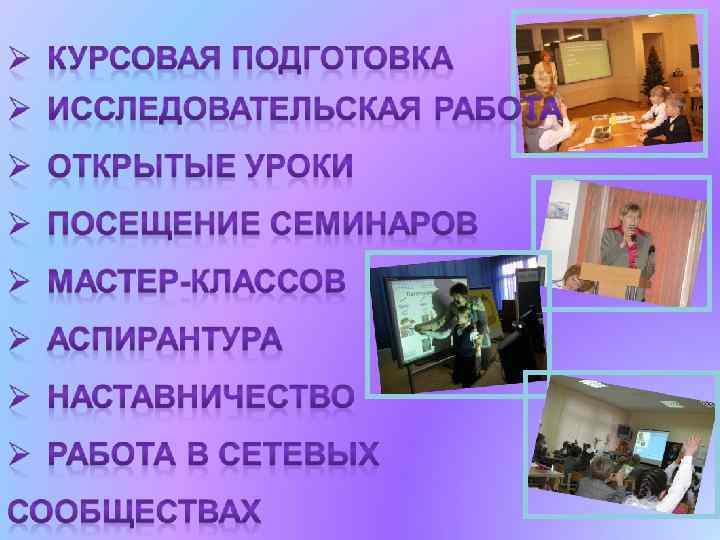 • «Планирование работы на новый учебный год» . • «Повышение качества педагогического труда и уровня пед. культуры учителя» . • «Портфолио как одна из форм оценивания индивидуальных достижений ученика и учителя» . • «Урок как форма повышения методического мастерства учителя» • «Анализ и самоанализ урока» • «Возможности использования различных УМК для реализации ФГОС» • «Подготовка к внедрению ФГОС. Формирование УУД » • КТД (коллективнотворческое дело), • Деловая игра, мозговой штурм, анкетирование учителей, • Круглый стол, • Мастер-класс • Педагогический консилиум, • Семинар – практикум • Дистанционное обучение