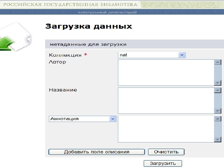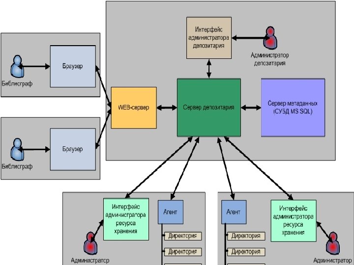 Web-сервер • Web-сервер используется для предоставления интерфейса взаимодействия пользователей с депозитарием. Пользователи с помощью браузера могут авторизоваться, осуществлять поиск по метаданным, добавлять новые и редактировать имеющиеся объекты данных.