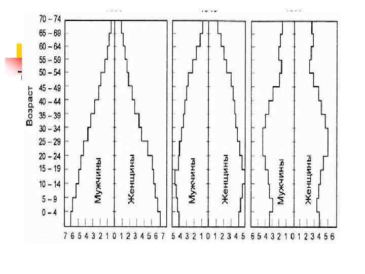 n n n 3) регрессивный тип. Основание пирамиды еще более узкое по сравнению с пирамидой стационарного типа, однако увеличивается ее верхняя часть: по ширине она превышает основание. Это означает, что возрастная структура населения характеризуется очень низким уровнем рождаемости и низкой тщетностью. Численность населения в данном случае уменьшается в результате снижения числа рождений, и для его возрастной структуры характерна высокая доля лиц пожилых и старых возрастов и низкая доля детей. Регрессивная структура характеризуется низким удельным весом детей и значительно большим удельным весом пожилых людей и не обеспечивает дальнейшего роста заселения