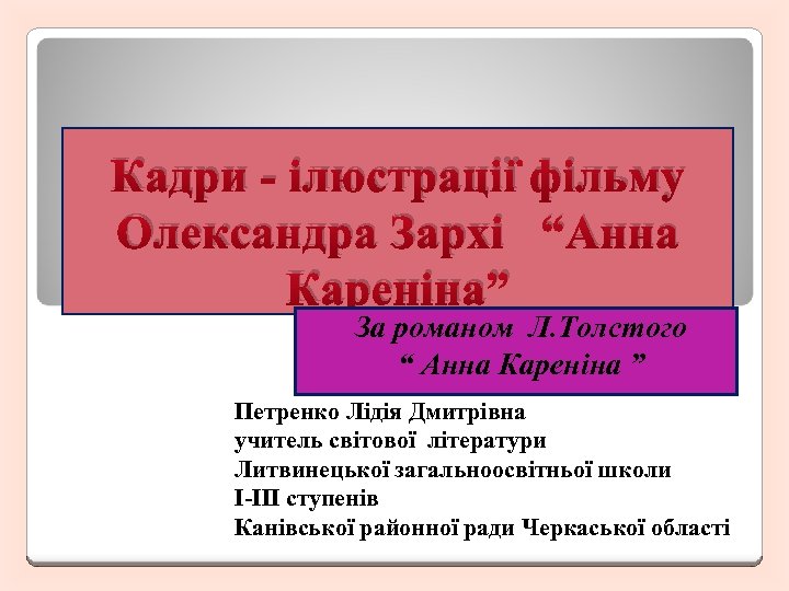 Кадри - ілюстрації фільму Олександра Зархі “Анна Кареніна” За романом Л. Толстого “ Анна Кареніна ” Петренко Лідія Дмитрівна учитель світової літератури Литвинецької загальноосвітньої школи І-ІІІ ступенів Канівської районної ради Черкаської області