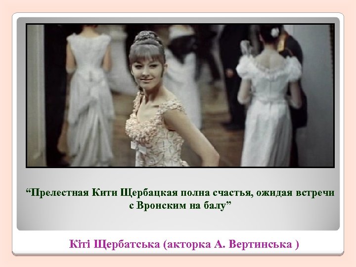 “Прелестная Кити Щербацкая полна счастья, ожидая встречи с Вронским на балу” Кіті Щербатська (акторка А. Вертинська )