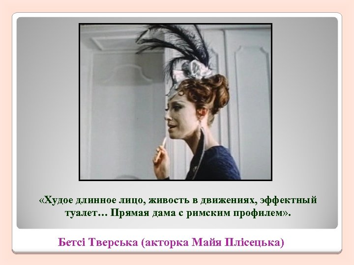 «Худое длинное лицо, живость в движениях, эффектный туалет… Прямая дама с римским профилем» . Бетсі Тверська (акторка Майя Плісецька)