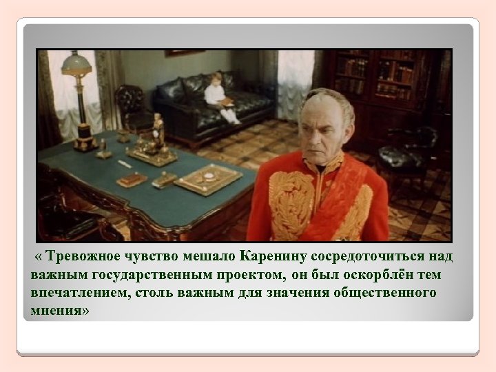 « Тревожное чувство мешало Каренину сосредоточиться над важным государственным проектом, он был оскорблён тем впечатлением, столь важным для значения общественного мнения»