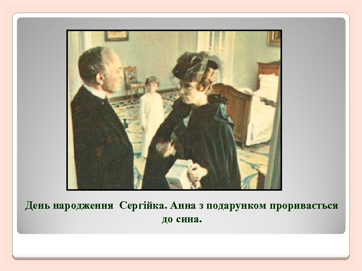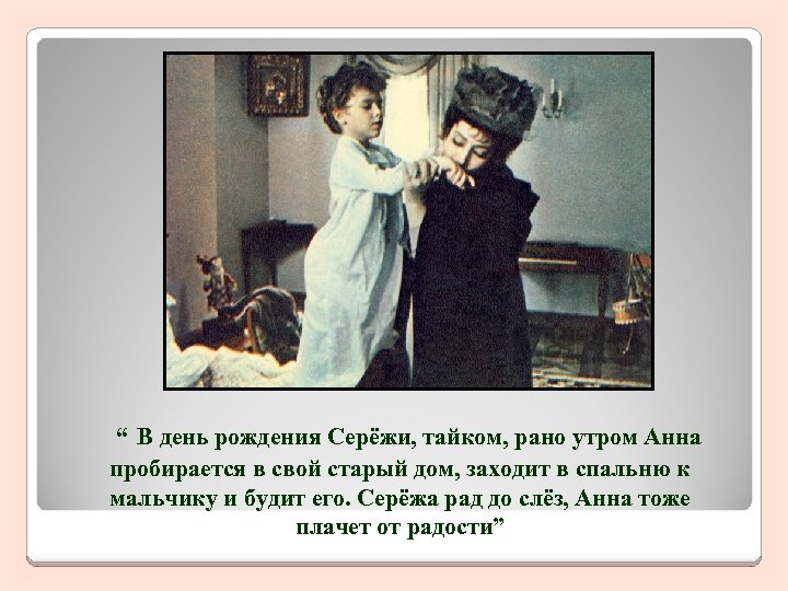 “ В день рождения Серёжи, тайком, рано утром Анна пробирается в свой старый дом, заходит в спальню к мальчику и будит его. Серёжа рад до слёз, Анна тоже плачет от радости”
