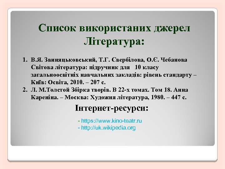 Список використаних джерел Література: 1. В. Я. Звиняцьковський, Т. Г. Свербілова, О. Є. Чебанова Світова література: підручник для 10 класу загальноосвітніх навчальних закладів: рівень стандарту – Київ: Освіта, 2010. – 207 с. 2. Л. М. Толстой Збірка творів. В 22 -х томах. Том 18. Анна Кареніна. – Москва: Художня література, 1980. – 447 с. Інтернет-ресурси: - https: //www. kino-teatr. ru - http: //uk. wikipedia. org