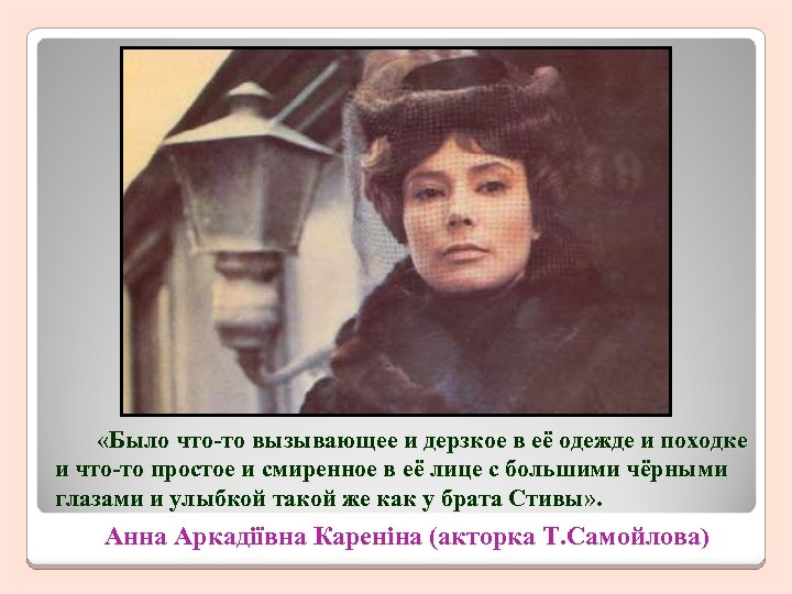 «Было что-то вызывающее и дерзкое в её одежде и походке и что-то простое и смиренное в её лице с большими чёрными глазами и улыбкой такой же как у брата Стивы» . Анна Аркадіївна Кареніна (акторка Т. Самойлова)