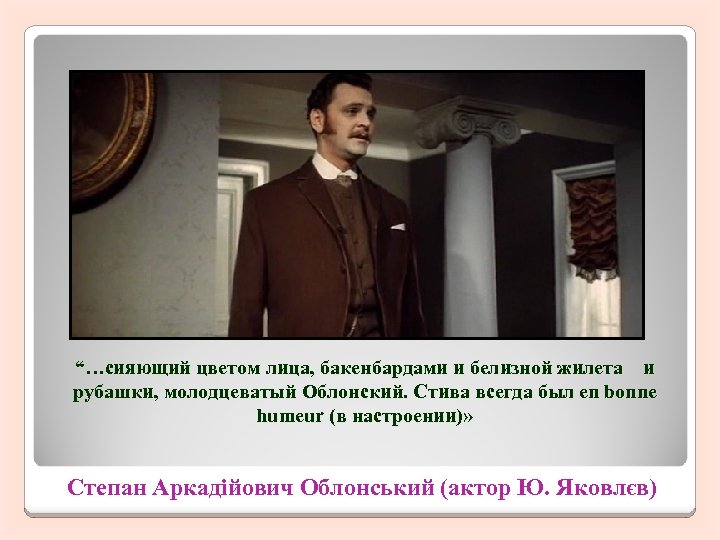 “…сияющий цветом лица, бакенбардами и белизной жилета и рубашки, молодцеватый Облонский. Стива всегда был en bonne humeur (в настроении)» Степан Аркадійович Облонський (актор Ю. Яковлєв)