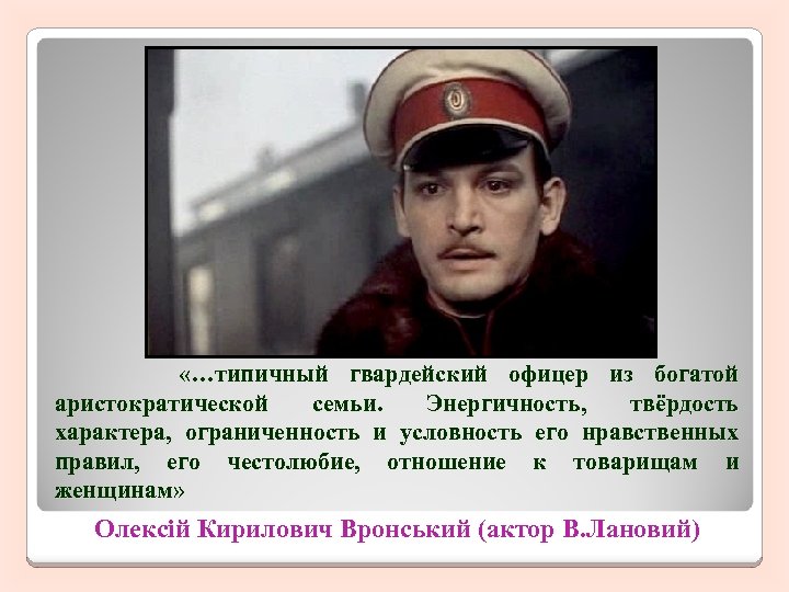 «…типичный гвардейский офицер из богатой аристократической семьи. Энергичность, твёрдость характера, ограниченность и условность его нравственных правил, его честолюбие, отношение к товарищам и женщинам» Олексій Кирилович Вронський (актор В. Лановий)