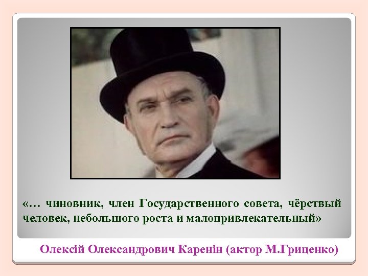 «… чиновник, член Государственного совета, чёрствый человек, небольшого роста и малопривлекательный» Олексій Олександрович Каренін (актор М. Гриценко)