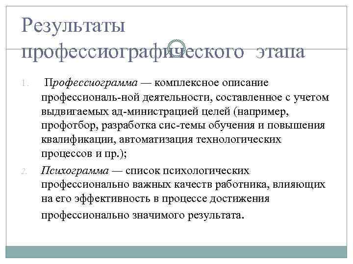 Результаты профессиографического этапа 1. 2. Профессиограмма — комплексное описание профессиональ ной деятельности, составленное с учетом выдвигаемых ад министрацией целей (например, профотбор, разработка сис темы обучения и повышения квалификации, автоматизация технологических процессов и пр. ); Психограмма — список психологических профессионально важных качеств работника, влияющих на его эффективность в процессе достижения профессионально значимого результата.