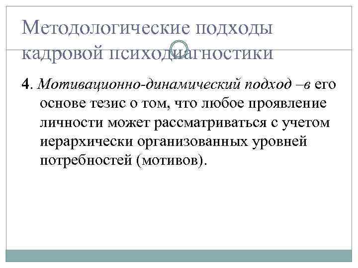 Методологические подходы кадровой психодиагностики 4. Мотивационно-динамический подход –в его основе тезис о том, что любое проявление личности может рассматриваться с учетом иерархически организованных уровней потребностей (мотивов).