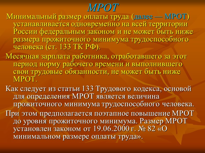 МРОТ Минимальный размер оплаты труда (далее — МРОТ) устанавливается одновременно на всей территории России федеральным законом и не может быть ниже размера прожиточного минимума трудоспособного человека (ст. 133 ТК РФ). Месячная зарплата работника, отработавшего за этот период норму рабочего времени и выполнившего свои трудовые обязанности, не может быть ниже МРОТ. Как следует из статьи 133 Трудового кодекса, основой для определения МРОТ является величина прожиточного минимума трудоспособного человека. При этом предполагается поэтапное повышение МРОТ до уровня прожиточного минимума. Размер МРОТ установлен законом от 19.06.2000 г. № 82 «О минимальном размере оплаты труда».