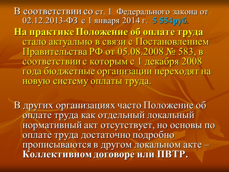 В соответствии со ст. 1 Федерального закона от 02.12.2013-ФЗ с 1 января 2014 г. 5 554руб. На практике Положение об оплате труда стало актуально в связи с Постановлением Правительства РФ от 05.08.2008 № 583, в соответствии с которым с 1 декабря 2008 года бюджетные организации переходят на новую систему оплаты труда. В других организациях часто Положение об оплате труда как отдельный локальный нормативный акт отсутствует, но основы по оплате труда достаточно подробно прописываются в другом локальном акте – Коллективном договоре или ПВТР.