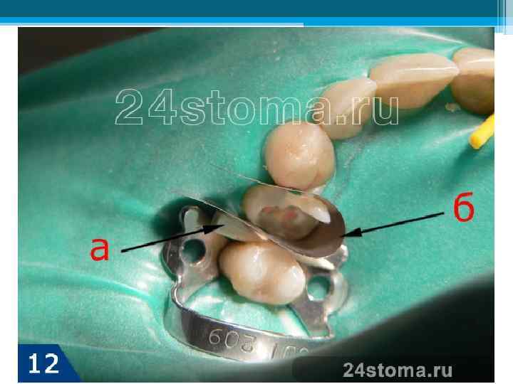 6. Медикаментозная обработка кариозной полости – сформированная в процессе удаления кариозных тканей полость в зубе – обрабатывается антисептиками. 7. Восстановление контактного пункта между зубами – Если кариес лечится на контактной (межзубной) поверхности зуба, то необходимо также восстанавливать боковую стенку зуба. Это достаточно трудоемкая и сложная задача, чем просто лечение среднего кариеса, например, на жевательной поверхности зуба. В этом случае добавляется еще один этап – установка специальных приспособлений для восстановления боковой стенки зуба. К таким приспособлениям относится клинья (а) и матрица (б) на рис.