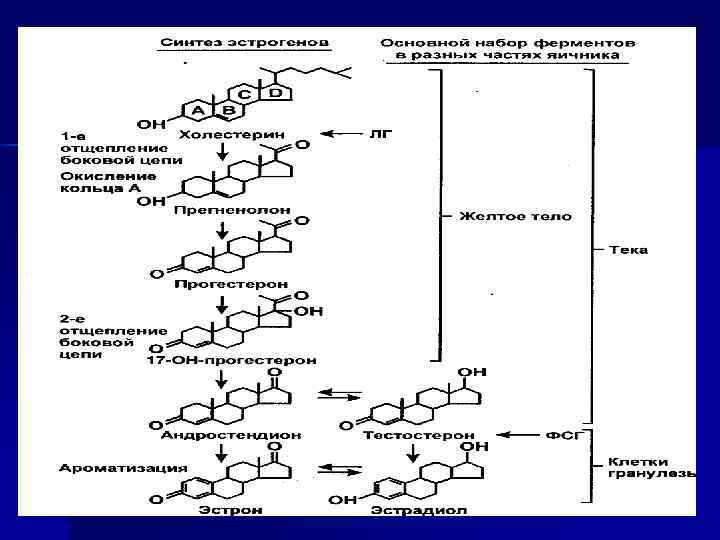 СТЕРОИДОГЕНЕЗ В ЯИЧНИКАХ ХОЛЕСТЕРИН (попадает в яичник с током крови) ПЕРВЫЕ ЭТАПЫ СИНТЕЗА ФСГ ОСНОВНАЯ МИШЕНЬ ДЕЙСТВИЯ – ЗЕРНИСТЫЕ КЛЕТКИ (ГРАНУЛЕЗА) ЛГ ОСНОВНАЯ МИШЕНЬ ДЕЙСТВИЯ – КЛЕТКИ ВНУТРЕННЕЙ ПОКРЫШКИ (ТЕКА) ПРОЛИФЕРАЦИЯ ЗЕРНИСТЫХ КЛЕТОК В РАСТУЩЕМ ФОЛЛИКУЛЕ СИНТЕЗ АНДРОГЕНОВ (АНДРОСТЕНДИОН И ТЕСТОСТЕРОН) СИНТЕЗ АРОМАТАЗ КОНЕЧНЫЙ ЭТАП СИНТЕЗА АРОМАТИЗАЦИЯ АНДРОГЕНОВ В ЭСТРОГЕНЫ В ГРАНУЛЕЗНЫХ КЛЕТКАХ ФОЛЛИКУЛОВ ЭСТРАДИОЛ ЭСТРОН