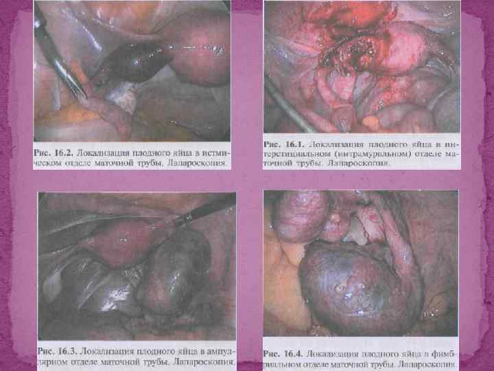 Яичниковая беременность Показаны лапароскопия, резекция яичника в пределах здоровых тканей (если нет геморрагического шока). При невозможности выполнения лапароскопии или при значительной тяжести состояния пациентки выполняют лапаротомию, резекцию яичника. Овариэктомия требуется редко.