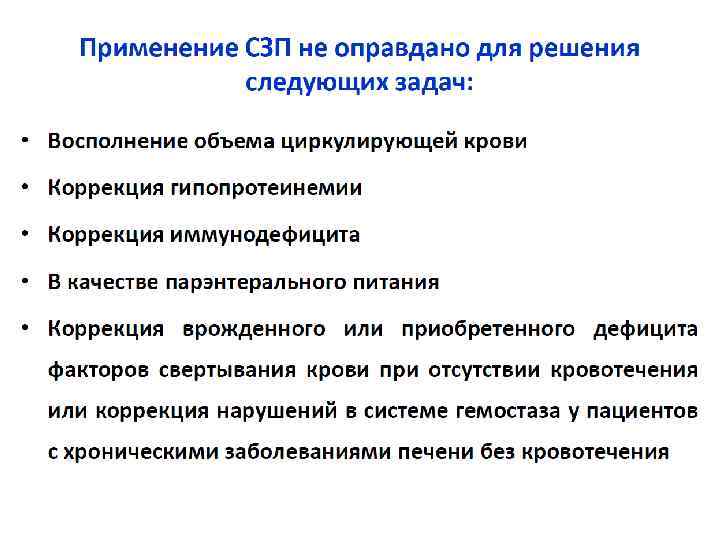 1. Тромбоконцентрат рекомендуется при активном кровотечении и количестве тромбоцитов < 50; или при высоком риске кровотечения и количестве тромбоцитов< 20 2. СЗП рекомендуется при активном кровотечении и у пациентов, нуждающихся в инвазивных процедурах с ↑ PT / PTT ( > 1, 5 от нормы) 3. Концентрат фибриногена (или криопреципитат) рекомендуется при активном кровотечении и фибриногене < 1, 5 г/л 4. Концентрат протромбинового комплекса рекомендуется при активном кровотечении (альтернатива СЗП)
