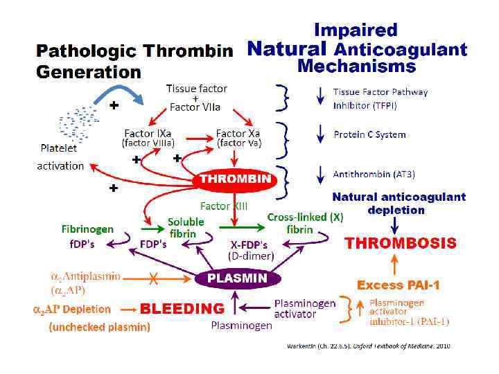 Дисбаланс между коагуляцией и фибринолизом Коагуляционная система Фибринолитическая система Ключевые медиаторы ДВС-синдрома Внутрисосудистая циркуляция сгустков фибрина и осаждение их в микроциркуляторном русле Генерализованный лизис фибрина и факторов свертывания, нарушение транскапиллярного обмена ДВС-синдром, СПОН (Cvachovec K. et al. , 2000; Okajima K. , 2000; Asakura H. et al. , 2001)