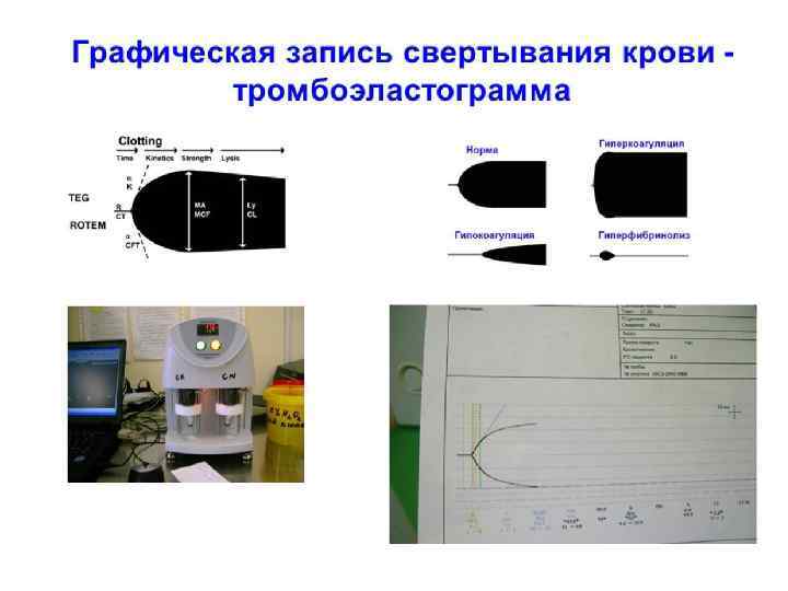 Диагностика ДВС-синдрома Тромбоэластографическое отображение Характеристика состояния Тромбоэластографическое отображение Активация коагуляции, т. е. коагуляционный вариант ДВСсиндрома Гиперкоагуляция на фоне угнетения фибринолиза и формирования плотного сгустка Активация фибринолиза, т. е. фибринолитический вариант ДВС-синдрома Активация фибринолиза на фоне гипокоагуляции и формирования рыхлого сгустка