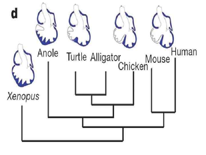 Схема родственных связей и эволюции сердца у наземных позвоночных. Синим цветом показаны области экспрессии гена. Tbx 5. Слева направо: лягушка, ящерица, черепаха, крокодил, курица, мышь, человек. Reptilian heart development and the molecular basis of cardiac chamber evolution // Nature. 2009. V. 461. P. 95– 98.