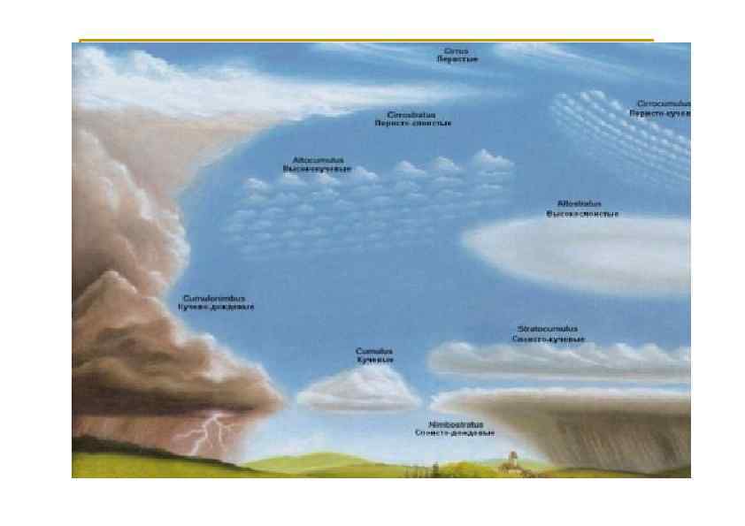 Классификация облаков Учитывается внешний вид и высота их расположения. Облака могут образовываться в тропосфере на всех h. Но, каждое СЕМЕЙСТВО облаков располагается в основном только в определенном диапазоне высот. Международный атлас облаков, облако делят по международной классификации на 4 семейства и 10 родов.