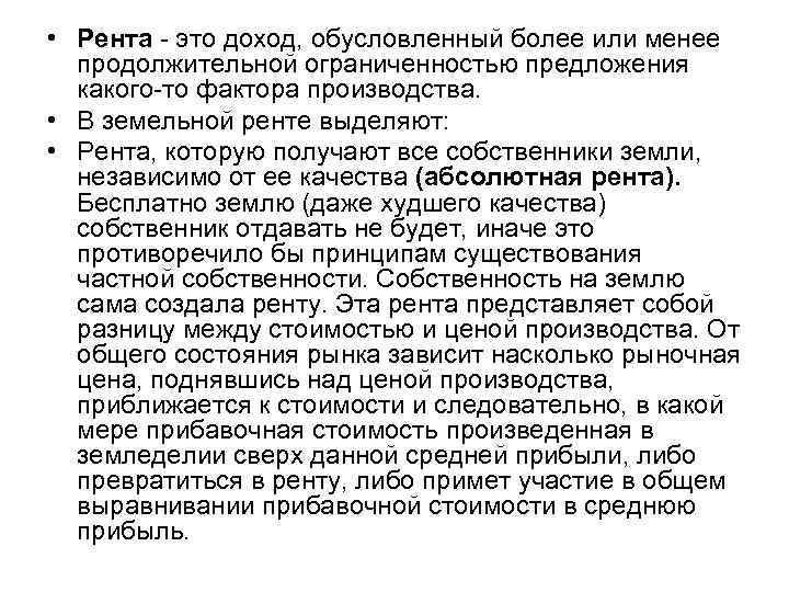 • Рента - это доход, обусловленный более или менее продолжительной ограниченностью предложения какого-то фактора производства. • В земельной ренте выделяют: • Рента, которую получают все собственники земли, независимо от ее качества (абсолютная рента). Бесплатно землю (даже худшего качества) собственник отдавать не будет, иначе это противоречило бы принципам существования частной собственности. Собственность на землю сама создала ренту. Эта рента представляет собой разницу между стоимостью и ценой производства. От общего состояния рынка зависит насколько рыночная цена, поднявшись над ценой производства, приближается к стоимости и следовательно, в какой мере прибавочная стоимость произведенная в земледелии сверх данной средней прибыли, либо превратиться в ренту, либо примет участие в общем выравнивании прибавочной стоимости в среднюю прибыль.