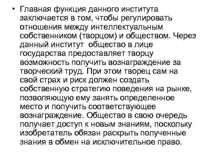 • Главная функция данного института заключается в том, чтобы регулировать отношения между интеллектуальным собственником (творцом) и обществом. Через данный институт общество в лице государства предоставляет творцу возможность получить вознаграждение за творческий труд. При этом творец сам на свой страх и риск должен создать собственную стратегию поведения на рынке, позволяющую ему занять определенное место и получить соответствующее вознаграждение. Общество в свою очередь получает доступ к новым знаниям, поскольку изобретатель обязан раскрыть полученные знания в обмен на исключительное право.