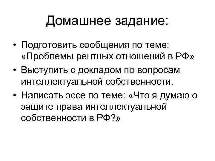 Домашнее задание: • Подготовить сообщения по теме: «Проблемы рентных отношений в РФ» • Выступить с докладом по вопросам интеллектуальной собственности. • Написать эссе по теме: «Что я думаю о защите права интеллектуальной собственности в РФ? »