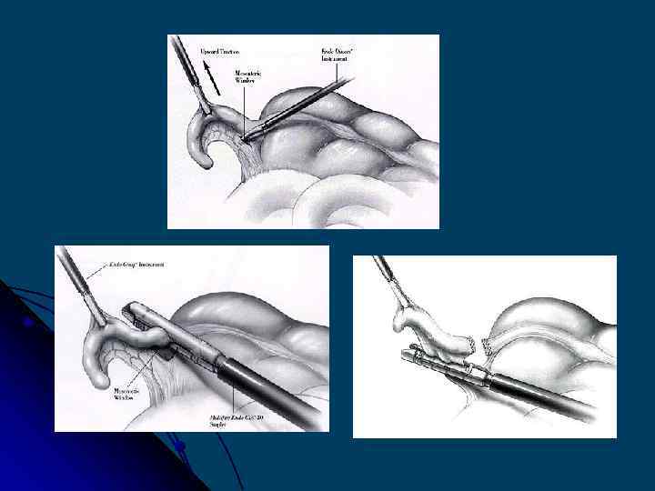 Доступны как изгибаемые, так и не изгибаемые сшивающие устройства, которые могут выполнить линейное сшивание с линейным рассечением. Эти сшивающие устройства позволяют накладывать линии скрепок длиной от 30 до 60 мм и с глубиной проникновения от 1, 5 до 4, 8 мм. Некоторые инструменты имеют изгибаемый конец, позволяющей сшивание и разделение под разными углами (до 45°) к оси троакара. Эта возможность особенно полезна в тазовой хирургии. Большинство систем, используемых в лапароскопии, накладывает шесть рядов скрепок, позволяя рассечение между ними. Эти системы применяются для: - разделения тканей (легкие, печень, брыжейка); - закрытия вен (почечные, надпочечные, печеночные вены и т. д. ); - закрытия артерий (печеночные, почечные, нижние брыжеечные артерии и т. д. ); - пересечения пищеварительного тракта (тонкая кишка, ободочная кишка, прямая кишка); - наложения желудочно-кишечных анастомозов.