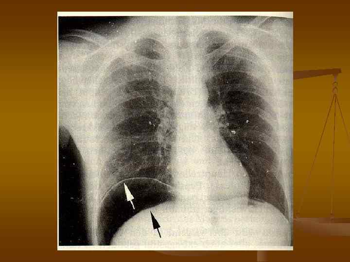 Абсолютный признак – появление на Р-гр свободного газа в брюшной полости чаще под правым куполом диафрагмы Р-гр лежа на спине Р-гр в вертикальной позиции Стрелками обозначена серповидная связка печени Компьютерная томограмма