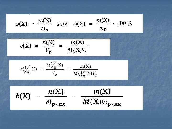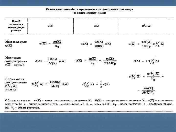 n n n n Свойства раствора существенно зависят от его состава. Поэтому важной количественной величиной раствора является концентрация его компонентов. Наиболее часто используются следующие способы выражения концентрации: Массовая доля ω(х) Молярная концентрация С(х) Нормальная концентрация С(1/z х) Молярная доля Моляльность b(х)