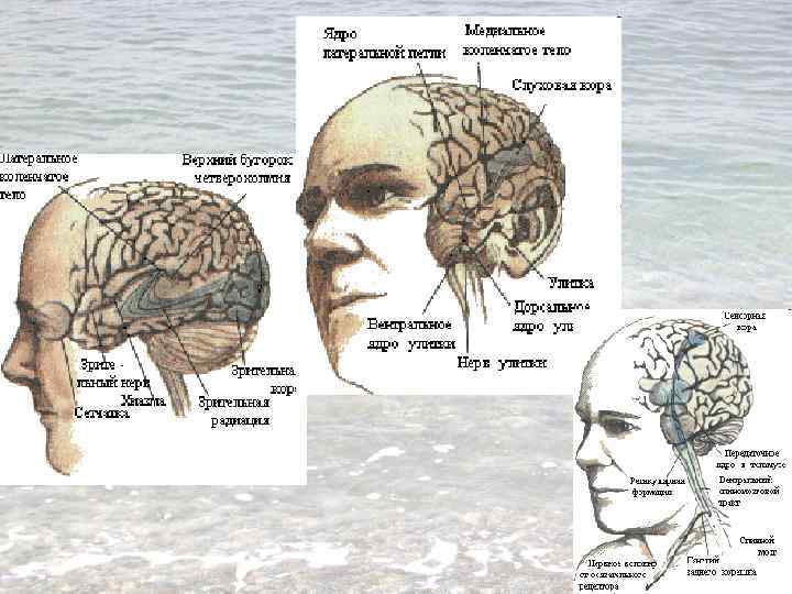 Специфические ядра таламуса ь Латеральное коленчатое тело (место переключения зрительных сигналов, аксоны направляются в затылочную долю коры); ь Медиальное коленчатое тело (место переключения слуховых сигналов, аксоны направляются в височную долю коры); ь Заднее вентральное ядро (место переключения сигналов с рецепторов кожи, туловища, проприорецепторов и т. п. ); ь Заднее медиальное ядро (висцерорецепция); ь Передние ядра таламуса (вкусовая и обонятельная рецепция).