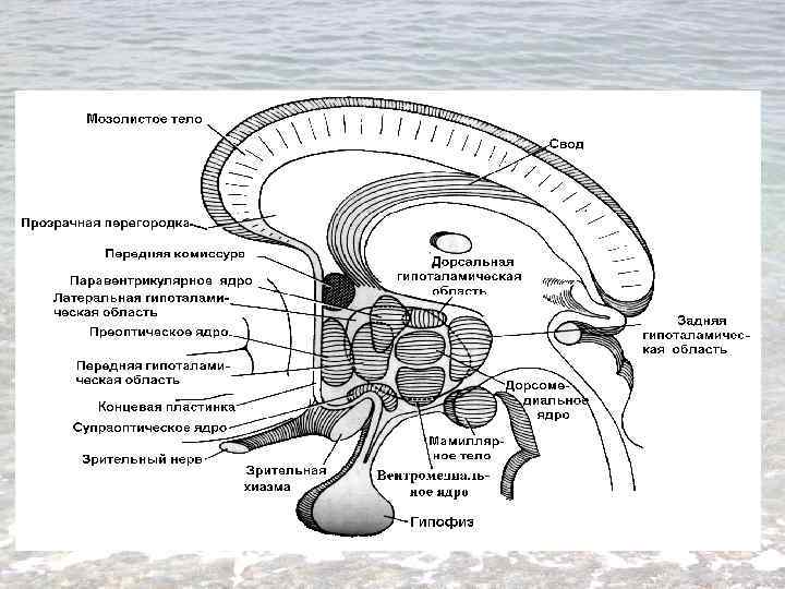 Распределение ядер гипоталамуса по областям Передняя гипоталамическая область 1) супраоптическое ядро 2) паравентрикулярные ядра 3) супрахиазмальные ядра Средняя гипоталамическая область 1) нижнемедиальное гипоталамическое ядро 2) верхнемедиальное гипоталамическое ядро 3) дорсальное гипоталамическое ядро 4) ядро воронки 5) серобугорные ядра Задняя гипоталамическая область 1) медиальное и латеральное ядра сосцевидного тела 2) заднее гипоталамическое ядро