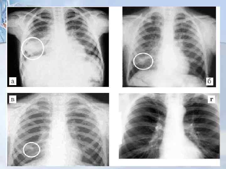 Рентгенологиялық көрініс A. B. C. D. Инфильтратты немесе пневмониялық фаза Сорылу фазасы (2 -4 ай бойы уақытылы спецификалық ем жүргізу нәтижесінде) Тығыздану фазасы (3 -5 ай) Әктену (кальцийлану) (12 ай немесе одан жоғары)