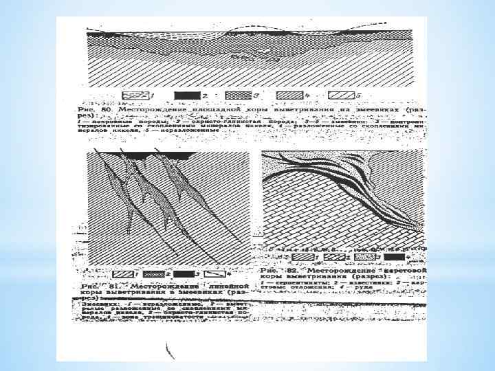 Связаны бокситовые месторождения. Они представлены панцирными корами на самых верхних их горизонтах. С латеритами по ультрабазитам - месторождения кобальт-железо-никелевых руд. Они подразделяются на: • площадные • комбинированные и линейные. Вторые являются комбинацией плащевидных горизонтов с крутыми зонами разломов и трещиноватости. Примером являются лимонитизированные залежи месторождений КМА и никеленосных кор выветривания *