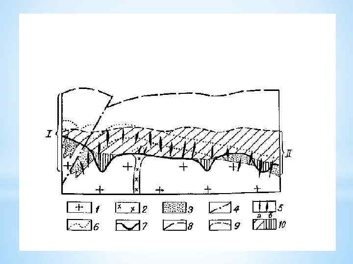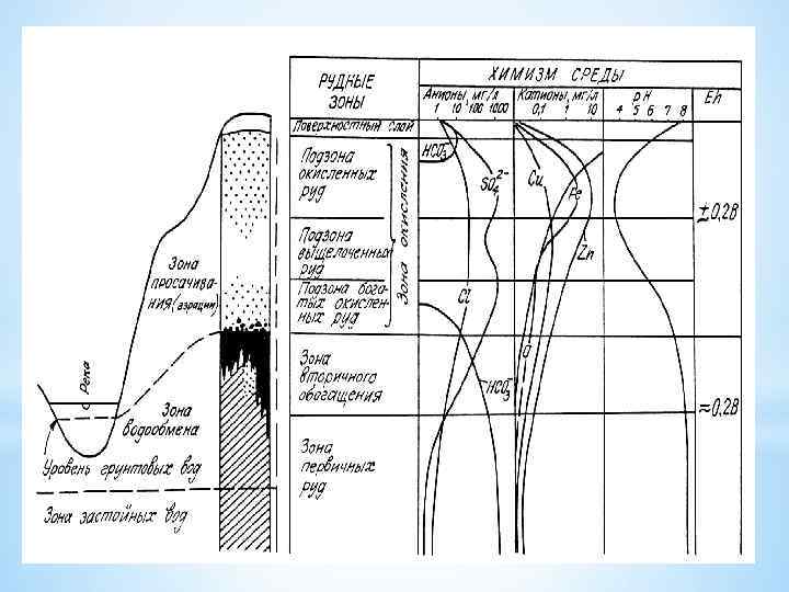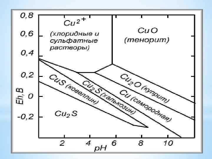 3. Неустойчивые в зоне окисления, но устойчивые в зоне обогащения 3. 1 Сульфиды Cu: § (i) Cu. Fe. S 2 (окисление – О 2)---Cu. SO 4+H 2 SO 4 ---Fe. SO 4 (гидратация)--Fe 2 O 3*n. H 2 O (лимонит)+Fe 2 O 3 (окисление)---Fe 3 O 4 (магнетит) § (ii) Cu. SO 4+Fe. S 2+H 2 S---Cu 2 S (халькозин)+Fe. SO 4+H 2 O § (iii) Cu. SO 4+Zn. S---Cu. S (ковелин)+Zn. SO 4 § (iv) Cu. S+O 2 ---Cu. SO 4+Cu 2 O (куприт); Cu. SO 4+Cu (самородный) 3. 2 Сульфиды Zn: В зоне окисления: Zn. S (окисление)---Zn. SO 4 § (i) Zn. SO 4 (реакция с Ca. CO 3)---Zn. CO 3 (смитсонит)+Ca. SO 4 § (ii) Zn. SO 4+Si. O 2+O 2 ---Zn[Si. O 7](OH)2*n. H 2 O (каламин) В зоне обогащения: Zn. S+ Cu. SO 4 ---Cu. S (ковелин)+Zn. So 4; Zn. SO 4+H 2 S---Zn. S (вюртцит)+H 2 So 4 4. Вновь образующиеся минералы (отсутствуют в первичной руде) Pb. CO 3 (церуссит)+Mo---Pb[Mo. O 4](вульфенит)+CO 2 Pb. CO 3 (церуссит)+V+HCl---Pb 5 Cl[VO 4](ванадинит)