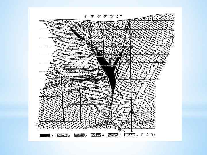 Изменяютсяся: • • • Слабо Средне очень сильно (особо эффектны изменения солянокупольных месторождений – кепрок) Зональность (сверху вниз): 1. Глинистый остаток от солей (несколько метров) 2. Карбонатные породы (десятки метров) деформированные с битумами и залежами нефти 3. Линзы с вкраплениями самородной серы 4. Ангидриты и гипсы. Граница гипсов горизонтальная – уровень грунтовых вод – «соляное зеркало» *