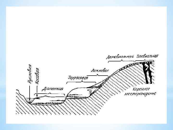 *Это континентальные и прибрежно-морские терригенные образования. Выделяют - россыпи, кварцевые пески и строительные материалы. Россыпь - скопление рыхлого или сцементированного обломочного материала, содержащего в виде зерен, их обломков либо агрегатов ценные минералы. В них имеются: Ø Au, Pt и платиноиды, U, Th, Y, TR, Sc, V, Zr, Ta, Nb, Ti, Sn, W, Be, Hg, Fe, Cr Ø драгоценные и поделочные камни (алмаз, изумруд, корунд, гранаты, топаз, турмалин, янтарь, аметист, агат, горный хрусталь и др. ) Ø формовочные, стекольные и строительные пески *