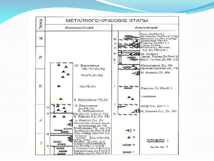 В киммерийско-альпийских складчатых системах типичны скарновые и трещино-жильные образования, что связано с возрастанием мощности и жесткости континентальной коры Особенность периода - появление на континентах провинций с регенерированными осадочнокатагеническими стратиформными месторождениями в карбонатных толщах