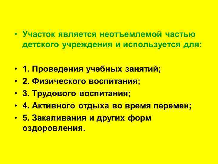 Требования к устройству участков • На территории всех детских образовательных учреждений выделяют следующие зоны: • • 1) зоны отдыха и игр, 2) физкультурно спортивные площадки, 3) хозяйственные площадки. 4) в школах и ПУ – учебно опытные зоны. Игровые площадки детсада • 1) 7, 2 кв. м на 1 ребенка для детей младенческого и раннего возраста; и 9, 0 кв. м на 1 ребенка дошкольника. • 2) на территории каждой групповой площадки – теневой навес площадью из расчета не менее 2 кв. м на одного ребенка, который оборудуется деревянным полом и с трех сторон загораживается от ветра и осадков.