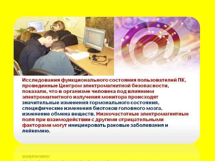 Использование в учебном процессе инновационных образовательных программ и компьютеров Вредное влияние компьютера на здоровье: 1. Вызывает напряжение зрения, 2. Вызывает напряжение опорно двигательного аппарата, 3. Компьютер может генерировать шум, 4. Ухудшает микроклимат помещения, (повышает температуру и снижает влажность), 5. Повышает запыленность воздуха, 6. Излучает электромагнитные неионизирующие излучения и ионизирующие излучения (мягкое рентгеновское излучение).