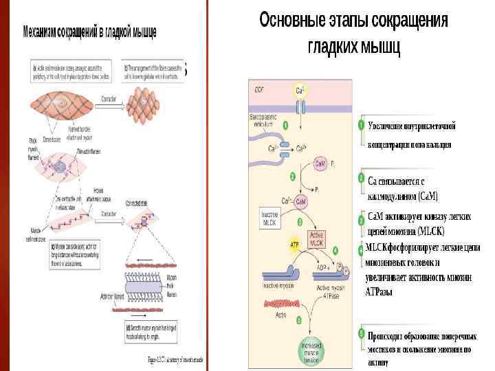 Элементы (белки) сократительного аппарата ГМК Плотные тельца Прикрепительные пластинки Сократительные филаментозные белки: Актин – крепится к ПТ и ПП; Миозин – локализован вдоль актина Связующие филаменты: виментин, десмин и др. связывают ПТ и ПП в единый комплекс Ионы кальция в кавеолах и а. ЭПС