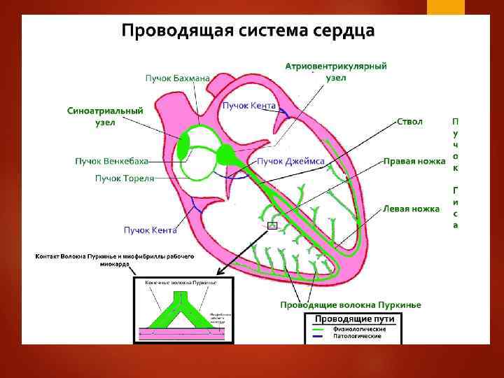 Проводящие кардиомиоциты: их разновидности Р – клетки (пейсмейкеры) англ. рale – бледный – генерерируют электрический сигнал Переходные транзиторые клетки(от англ. transitional - переходный)передают электрический сигнал Кардиомиоциты волокон Пуркинье – передают электрический сигнал посредством щелевидных соединений на сократительные кардиомиоциты
