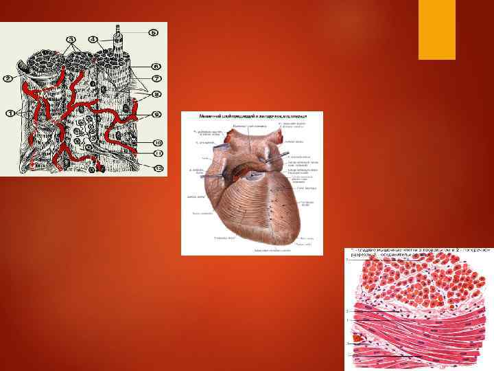 Сердечная мышечная ткань Кардиомиоциты – объединены в сердечные мышечные волокна с участием вставочных дисков – контактирующих поверхностей соседних кмц Базальная мембрана – «чехол» для сердечных МВ; Капилляры – вблизи каждого кардиомиоцита; трофика, доставка кислорода; Нервные окончания – регулируют работу кмц.