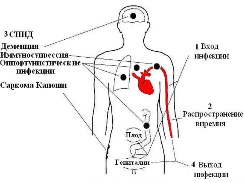 Активация провируса (антигены, цитокины, клеточные транскрипционные факторы), сборка вируса. Выход вируса в кровяное русло, внедрение в новые клетки. Гибель Т4-лимфоцитов: Нарушение метаболизма клетки Нарушение клеточной мембраны клетки Изменение соотношения CD4 / CD8 Снижение иммунокомпетентных клеток – появление вторичных заболеваний Нейротропность вируса – поражение головного мозга
