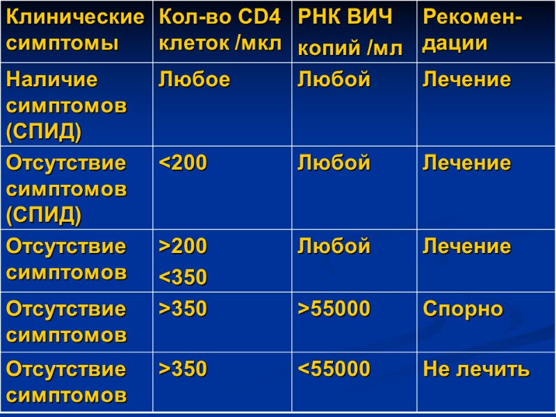 Схемы химиопрофилактики: АЗТ 0,2 г 3 р / д в течение 4 недель (риск заражения снижается на 79%) АЗТ 0,2 г 3 р / д + 3ТС 0,15 г 2 р / д + индинавир 0,8 г 3 р / д в течение 4 недель. Применение химиопрофилактики должно начинаться как можно раньше!