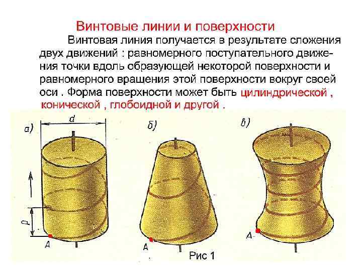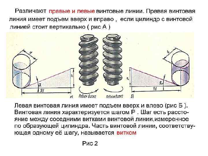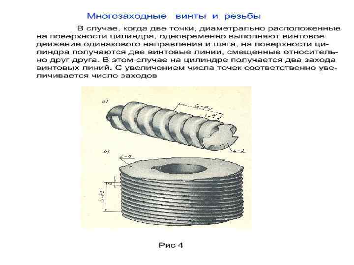 Условности изображения резьбы на стержне и в отверстии Резьба – это поверхность, образованная при винтовом движении плоского контура по цилиндрической или конической поверхности. Цилиндр или конус вместе с винтовым выступом называют винтом. Классификация резьбы : По назначению : • крепежная(в неподвижном состоянии), • ходовая (в подвижном состоянии). В зависимости от расположения поверхности : • наружная (нарезанная на стержне), • внутренняя (нарезанная в отверстии). По форме профиля: • треугольная, • трапециевидная, • прямоугольная, • круглая, • специальная. По величине шага: • крупная, • мелкая, • специальная. По числу заходов: • однозаходные, • многозаходные. По направлению винтовой линии: • правая (нитка резьбы нарезается по часовой стрелке), • левая (нитка резьбы нарезается против часовой стрелки).